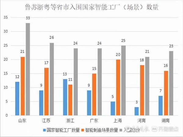 根据2021年度智能制造试点示范工厂和优秀场景名单,山东省工业和信息化厅在分析中指出,山东省首先共有12个项目入围智能制造试点示范工厂(全国110个),入围数量位列广东(13个)之后排名全国第二,高于江苏(9个)、浙江(9个);21个项目入围智能制造优秀场景(全国241个),入围数量位列全国第一,高于江苏(17个)、浙江(15个)、广东(11个)。我省合计总入围数量33个,排名全国第一,高于江苏(26个)、上海(25个)、广东(24个)、浙江(24个)。在数量上,山东在智能制造方面走在了全国前列,显示出了全省在新旧动能转换方面的力度和成效。