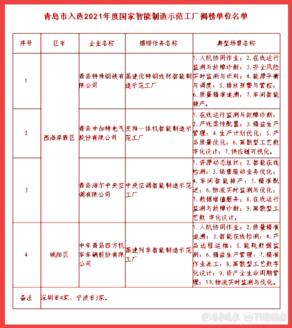 在2021年度智能制造试点示范工厂和优秀场景名单中,中车青岛四方机车、海尔中央空调等4家揭榜单位、青岛软控、海尔模具、环球集团重工等9家企业的14个典型场景入选,数量均位居同类城市前列。其中,仅海尔洗涤电器一家企业,就有“大批量定制”“智能仓储”“智能维护管理”“安全风险实时监测与识别”等四大场景入围智能制造优秀场景名单。